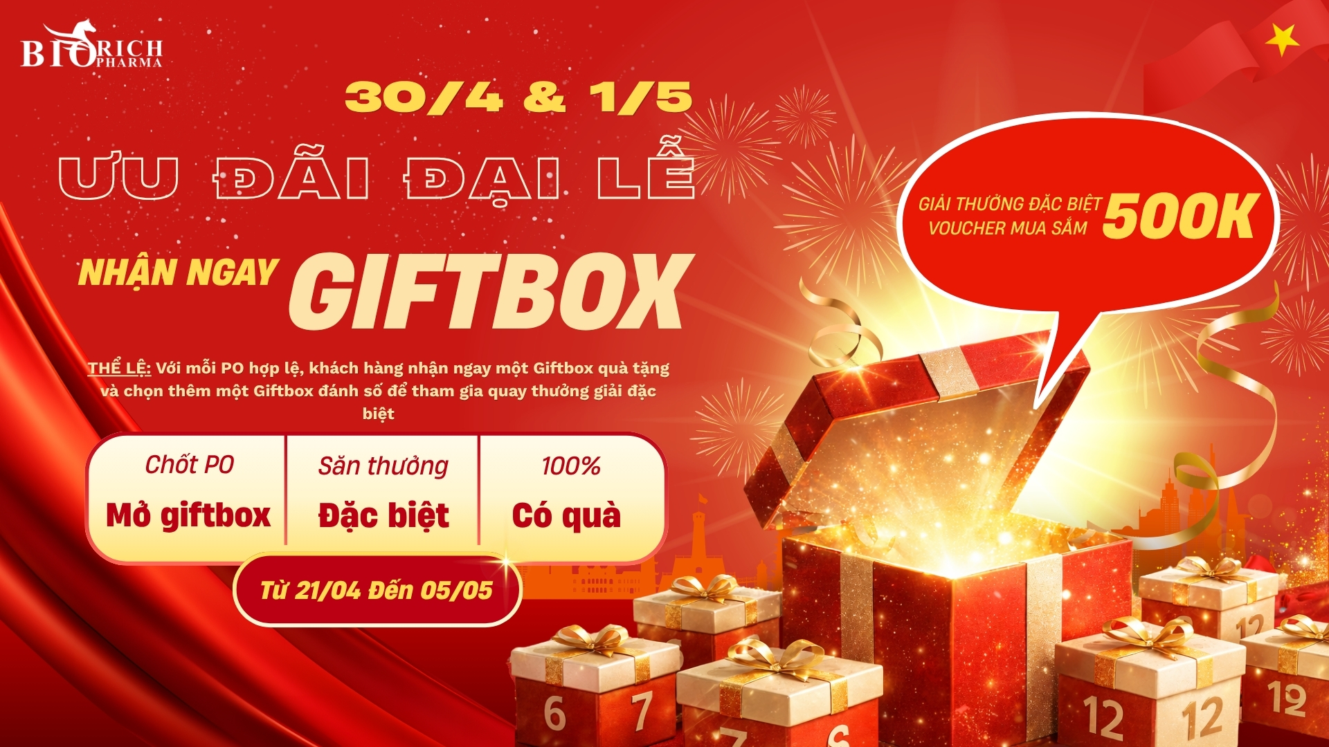 Nhân dịp kỷ niệm ngày Giải phóng miền Nam 30/4 và Quốc tế Lao động 1/5, Biorich Pharma triển khai chương trình Minigame Giftbox như một lời tri ân gửi đến Quý Khách Hàng.